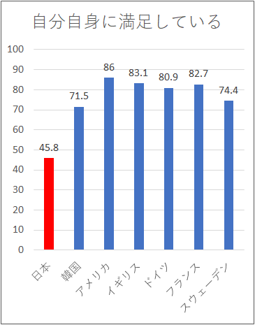 ※日本の数値は、「全国学力・学習状況調査」にて、「次のことがらがあなた自身にどのくらいあてはまりますか。」との問いに対し、「私は、自分自身に満足している」に「そう思う」「どちらかといえばそう思う」と回答した者の合計。