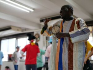 松岡大さんとのダンスワークショップは、障害の程度や特徴等に応じて2つのグループに分けて実施しました。毎回ウォーミングアップでは、意識しながら身体の部位を一つひとつ動かし、アーティストやアシスタントとペアになって身体をほぐしていきました。その後は、子どもたちが好きな曲を取り入れ、シフォン素材の布を使いながら、アーティストの動きをまねして踊ったり、振付のあるダンスに挑戦したりするほか、ペアワークや全体で一緒に踊る楽しさを味わいました。ワークショップの後半回からは、セネガル人の音楽家 ワガンさんも参加し、生演奏に合わせて身体を動かしたり、太鼓の演奏を体験したりするなど、音楽を身近に感じる時間もありました。最終日には、施設内の他の子どもたちや職員の方々を招いて成果発表会を行い、アンコールではお客さんも交えて、会場全体で一緒に踊るひとときを楽しみました。
