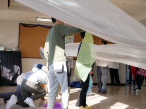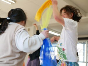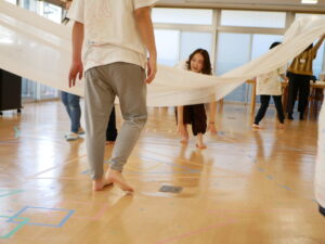 後半は城さんと宮代学園の子どもたちが中心となり、音楽にのって踊りました。最後は白い不織布がふわりふわりと動く中で、思うままに身体を動かしました。視線を交わしたり、ハイタッチをしたり、手をつないだり・・・。事前の打合せでは職員さんたちから「初めての場所でうちの子たちは気後れしないだろうか」「初めて会う人たちと一緒に活動できるのだろうか」と、心配する声も多く聞かれたのですが、ふたをあけてみれば、あっという間に両施設の子どもたちが入り混じり、お互いの存在をやんわりと感じながら楽しむ姿が見られました。むしろ普段よりも積極的に、いつもは見せない動きを見せてくれる子もいて、新しい顔ぶれや活動内容が良い刺激になったのかな、と担当の職員さんが嬉しそうに話してくださいました。