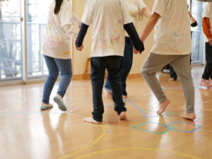 城俊彦さんのダンスワークショップは、8月からスタートして計5回(交流を含む)、最終日には施設の職員さんや入所児童、保護者を招いて成果発表会を行いました。毎回、子どもたちに馴染みのある音楽を使って、見よう見まねで踊ったり、友だちや職員さんと手を合わせて一緒に踊るなど、お互いのコミュニケーションを楽しんだり、不織布を使って動いたり、自由な感覚で身体を動かす時間を楽しみました。最初は引っ込み思案だった子が、最終日の発表の際には「一緒に踊ろう!」と職員さんを誘ってくれるようになったそうです。また、成果発表会で着る衣裳用のTシャツも、自分たちで絵を描いて製作しました。それ以来、絵を描くことにはまってしまった子もいるようで、担当の職員さんが「Rさんの趣味が一つ見つかった!」と喜んでいらっしゃいました。
