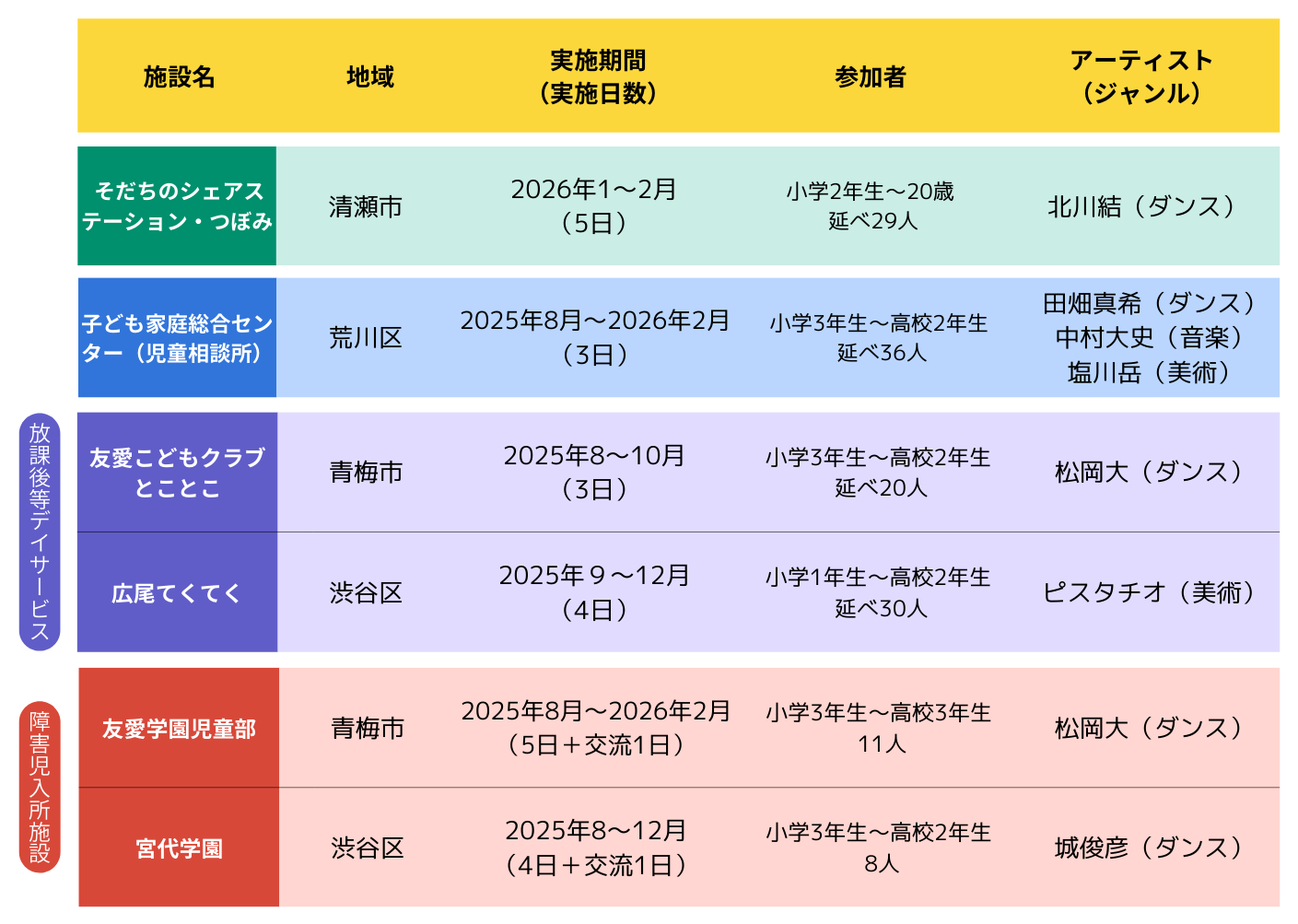 2025年度に文化庁「障害者等による文化芸術活動推進事業」の採択を受けて取り組んできた本企画では、児童相談所や子どもの居場所、障害児入所施設、放課後等デイサービスにおいてワークショップを行いました。さまざまな場所で生きづらさを抱え、支援を必要としている子どもたちが、障害の有無にかかわらず文化芸術に触れ、心を動かされる体験を通して、自分や他者の表現を大切に思える気持ちを育んでいく。そんな人と人とのつながりが生まれる場を目指してきました。また、2つの障害児入所施設による成果交流発表会は、普段はそれぞれの施設内で行っているワークショップを、施設を越えた「出会いの場」として展開した初の試みでした。本コラムでは、成果交流発表会当日の様子に加え、事前の打合せや準備の過程、そして振り返りの場で聞かれたアーティストや職員の方々の声も紹介していきます。これらの取り組みが、子どもたちの育ちを支える地域における、より包摂的な社会環境づくりの一助となることを願っています。