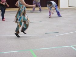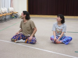 次は、横一列に並び、色んな歩き方をしてみよう!はじめは、ちょっとふざけながら走り抜けるだけだった子どもたちも、小山さんたちの声掛けや、実際に動きを見たりすることによって、少しずつ工夫する姿が見られました。背中でズリズリ進んでみたり、ロボットみたいに歩いたり、ポーズをとりながら動いてみたり…。のびのびと思い思いの動きをする子どもたちの様子は、もうそれだけで、舞台のワンシーンのようでした。