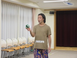 「ちょっとしたゲームをやろうかな」と、小山さんが取り出したのは、タオルを丸めた1つのボール。ボールを投げる時に「なげた!」、受け取る時に「とった!」と声に出しながら、みんなで自由にボールを投げ合うワークが始まりました。はじめは「やらなーい」と輪に加わらなかった子も、自分の元にボールが飛んでくると、思わず投げ返したりと、少しずつ輪に加わっていきます。