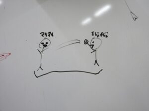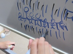 「ずっと歩き続けながらやってみよう」「3秒以内にボールは投げよう」など、1つずつルールを加えていくと、子どもたちもお互いに目を合わせ、声をかけあいながら、ボールのやりとりも活発になっていきました。 その傍らで、みんなの様子を絵で表現してくれる子も…!