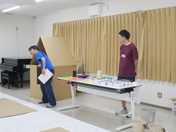 男の子たちは2日間かけて、個人制作とみんなで協力することの両方を体験できるような内容を検討しました。例えば家をつくるなど、1時間の中でも達成感が味わえて、且つ何か驚きも欲しい、という法務教官の方のお話を元に『光る自分空間』をつくることにしました。