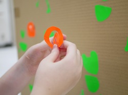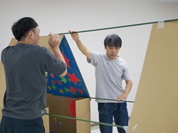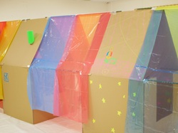 2日目は、それぞれの自分の空間にさらに装飾を加えた後、カラービニールシートと園芸用支柱を使用して、一つの街のようにつなげていきました。支柱を支える役割と、固定する役割など、一人ではできない作業は、大人も手伝いながらみんなで協力して完成させました。