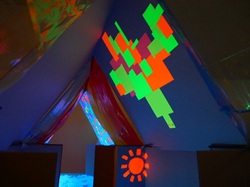 1日目の最後には、部屋を暗くして手持ちのブラックライトで自分の空間や他の人がつくった空間を鑑賞しました。蛍光塗料が光ると明るい時とは違う雰囲気が味わえて、「もっとこうしたい」など、翌日への期待が膨らんだ様子でした。