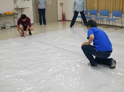 『透明エアドーム』は、部屋いっぱいの大きさのドームを、ホワイトシートと透明シートを貼り合わせてつくりました。シートを貼り合わせる作業も一人ではできないので、子どもたちも大人も一緒になって声をかけ合いながら作業をしました。