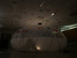 ドームの形が完成したら、事前にカットしてもらっていたカラフルなカッティングシートを貼って、最後はドームを膨らませて鑑賞タイム。部屋を暗くしてドームの中に入り、みんながつくったカッティングシートの影や色が部屋に漂う様子を楽しみました。