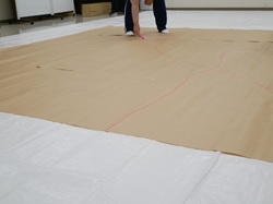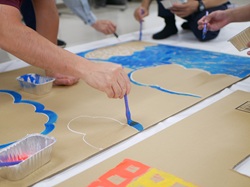 2日目の『光る絵』は、まずは部屋いっぱいに広げたクラフト紙にランダムにペンで線を引きました。その後、1人1枚、90cm×2mの大きさを分担して、ペンで引いた線をきっかけにして、模様を描いたり、形に色を塗ったり、自由に絵を描いていきました。