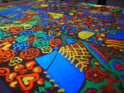 最後は、みんなの絵をまた一つにつなげて、ブラックライトの下で鑑賞しました。暗くなって絵が光ると歓声が上がり、絵の周りを一周して鑑賞しながら、何が描かれているかなど、お互いに気づいたことを伝え合う時間にもなりました。