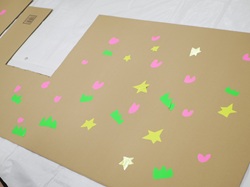 1日目は、まずは段ボールで一人一つの空間づくり。屋根と壁になる板段ボールに、蛍光塗料やカッティングシート、ペンなどを使って、自由に装飾を行い自分だけの空間をつくりました。絵を描くことに集中する子もいれば、カッティングシートを好きな形に切って模様を貼ることにする子など、つくり方もそれぞれでした。