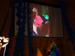 それぞれがつくった作品を、小型カメラで撮影してスクリーンに投影しながら、司会者のインタビューに答えるかたちで、作品の紹介を行いました。