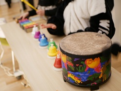「水中に住めるなら何がしたい?」「都市には、どんな生き物が住んでいるかな?」「水中都市のお祭りの音楽ってどんなだろう?」問いかけを重ねるたびに、イメージはどんどん膨らんでいき、「水中都市」、「楽器」、「生き物」の3つのチームに分かれて、創作を進めていくことになりました。
